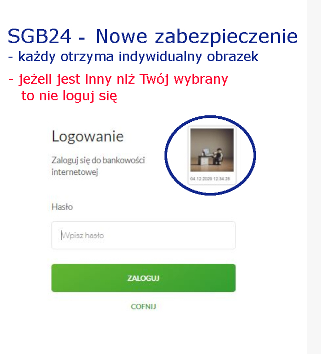 Dzięki temu łatwiej poznasz, czy jesteś na autentycznej stronie logowania do SGB24, czy na podstawionej w celu przechwycenia Twoich poufnych danych. Tzw. obrazek bezpieczeństwa zostanie przypisany do Twojego identyfikatora automatycznie 06 grudnia 2020 r.