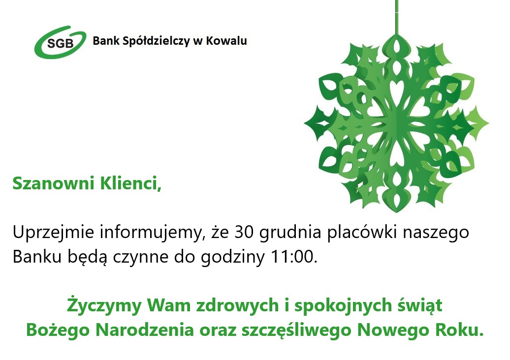 Uprzejmie informujemy, że 30 grudnia placówki naszego Banku będą czynne do godziny 11:00.