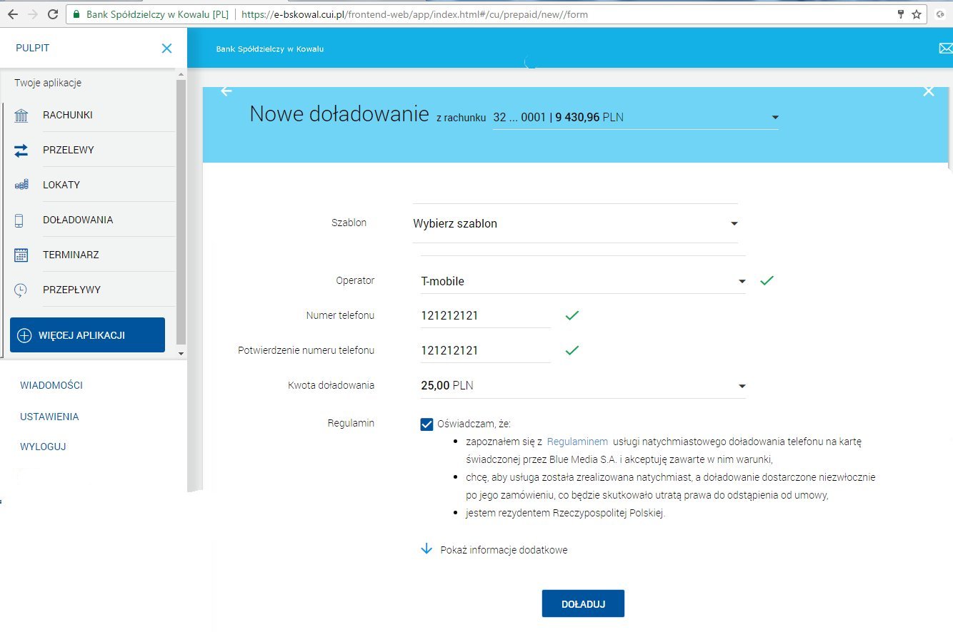 - po zalogowaniu wybieramy z menu DOŁADOWANIA a następnie NOWE